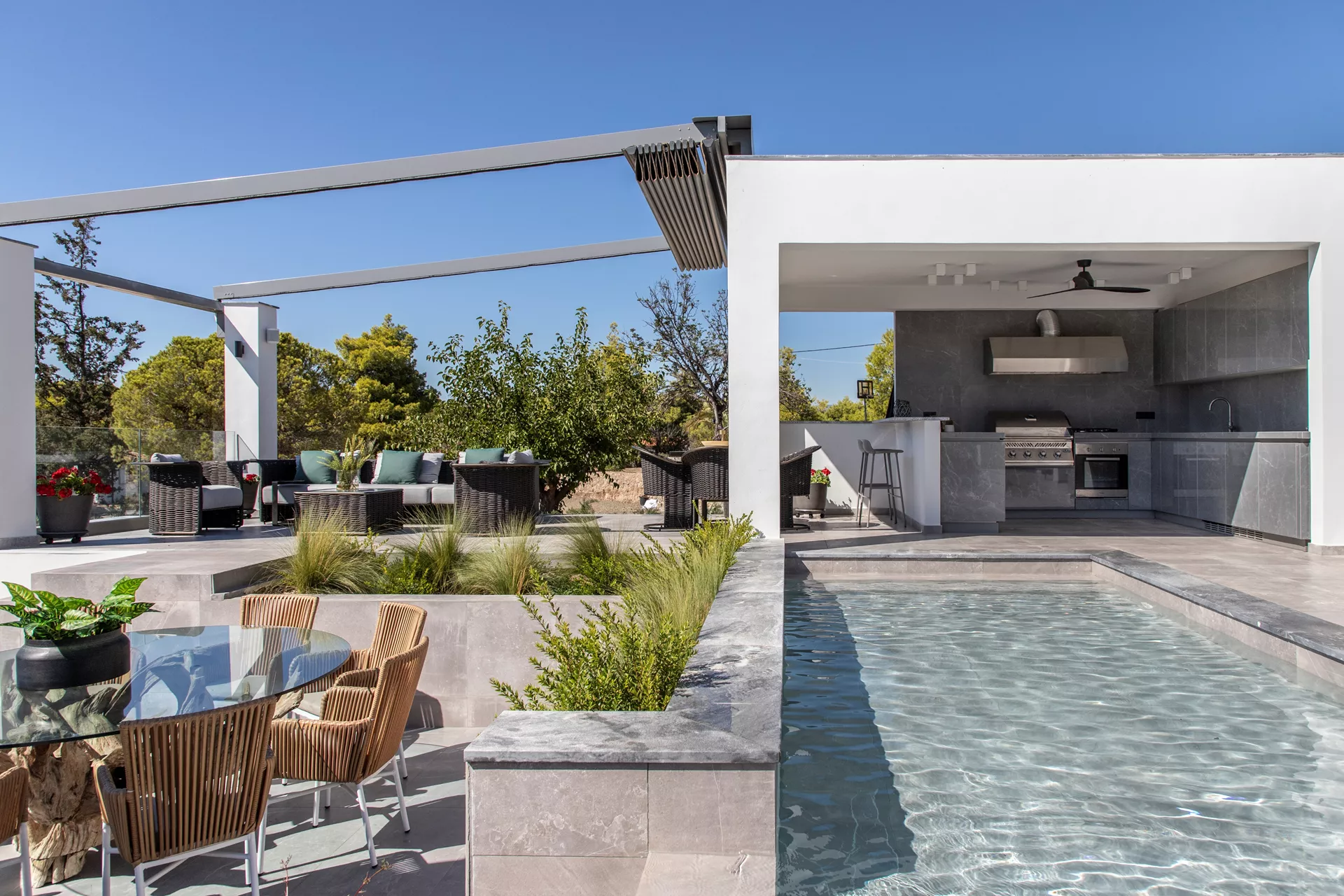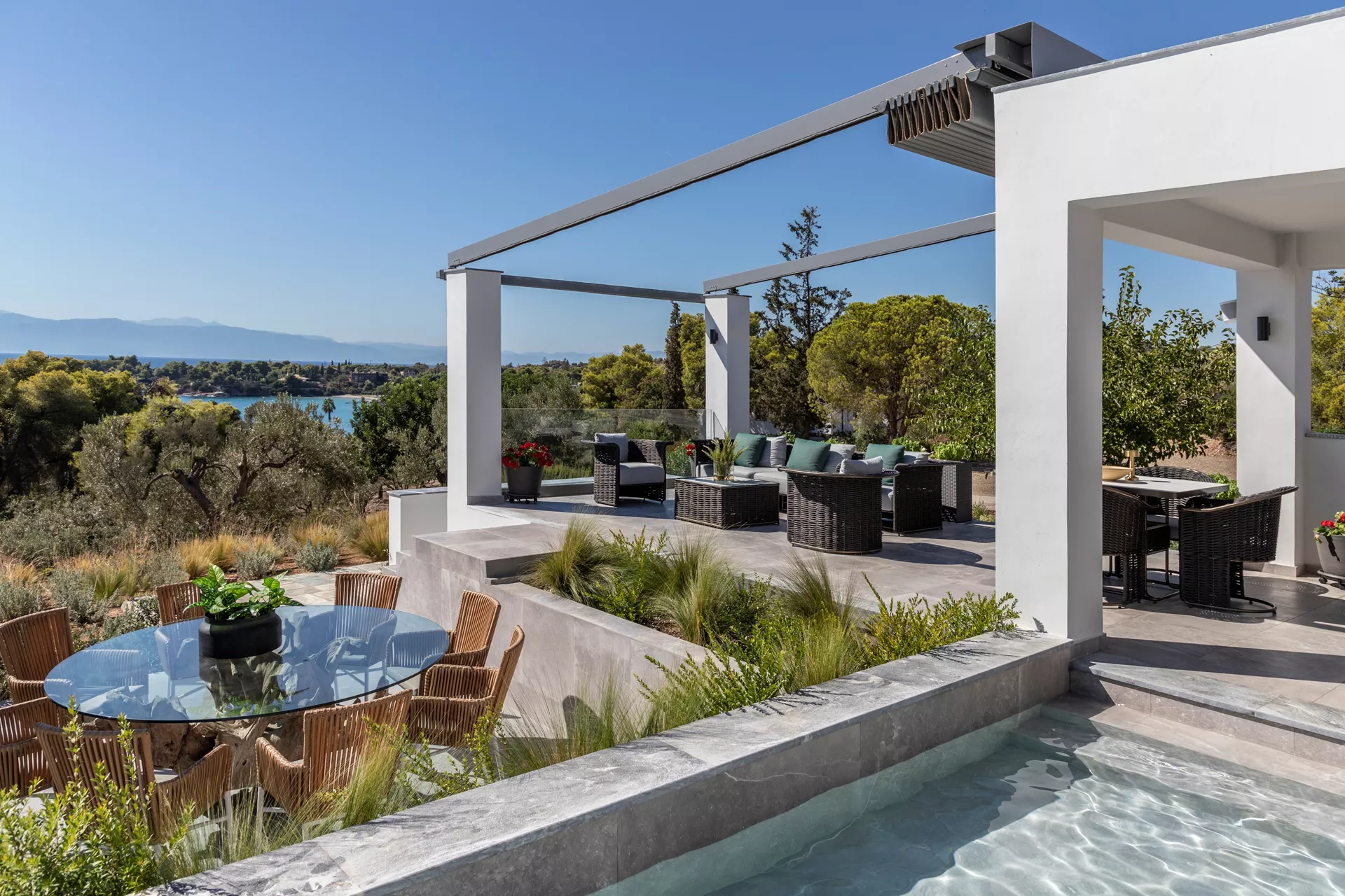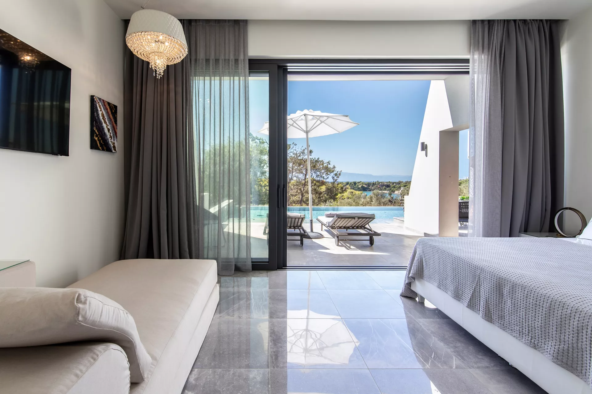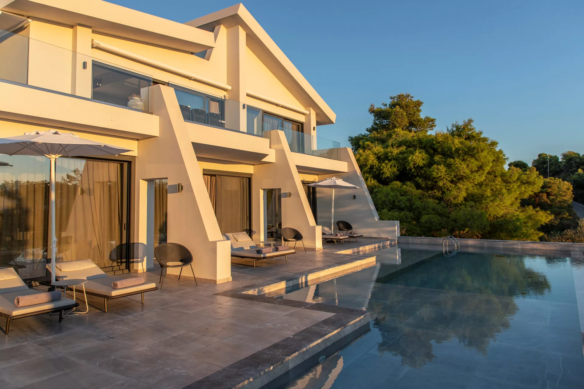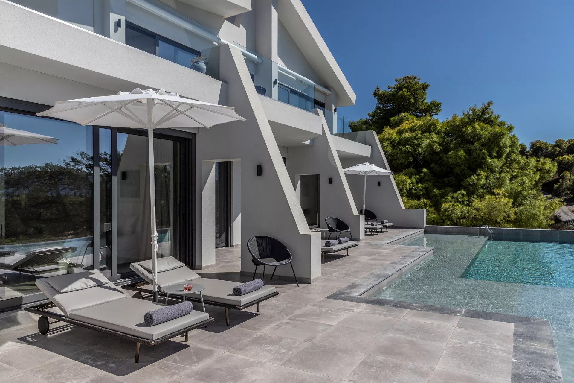 Κατεβαίνοντας στο δεύτερο επίπεδο, θα ανακαλύψετε τέσσερα πολυτελή υπνοδωμάτια, καθένα από τα οποία παρέχει άμεση πρόσβαση στην πισίνα. Τρία μπάνια, δύο από τα οποία είναι en suite, βρίσκονται επίσης σε αυτό το επίπεδο, μαζί με μια μικρή κουζίνα ιδανική για την προετοιμασία σνακ, παιδικών γευμάτων ή ενός δροσιστικού καφέ ή ποτού.