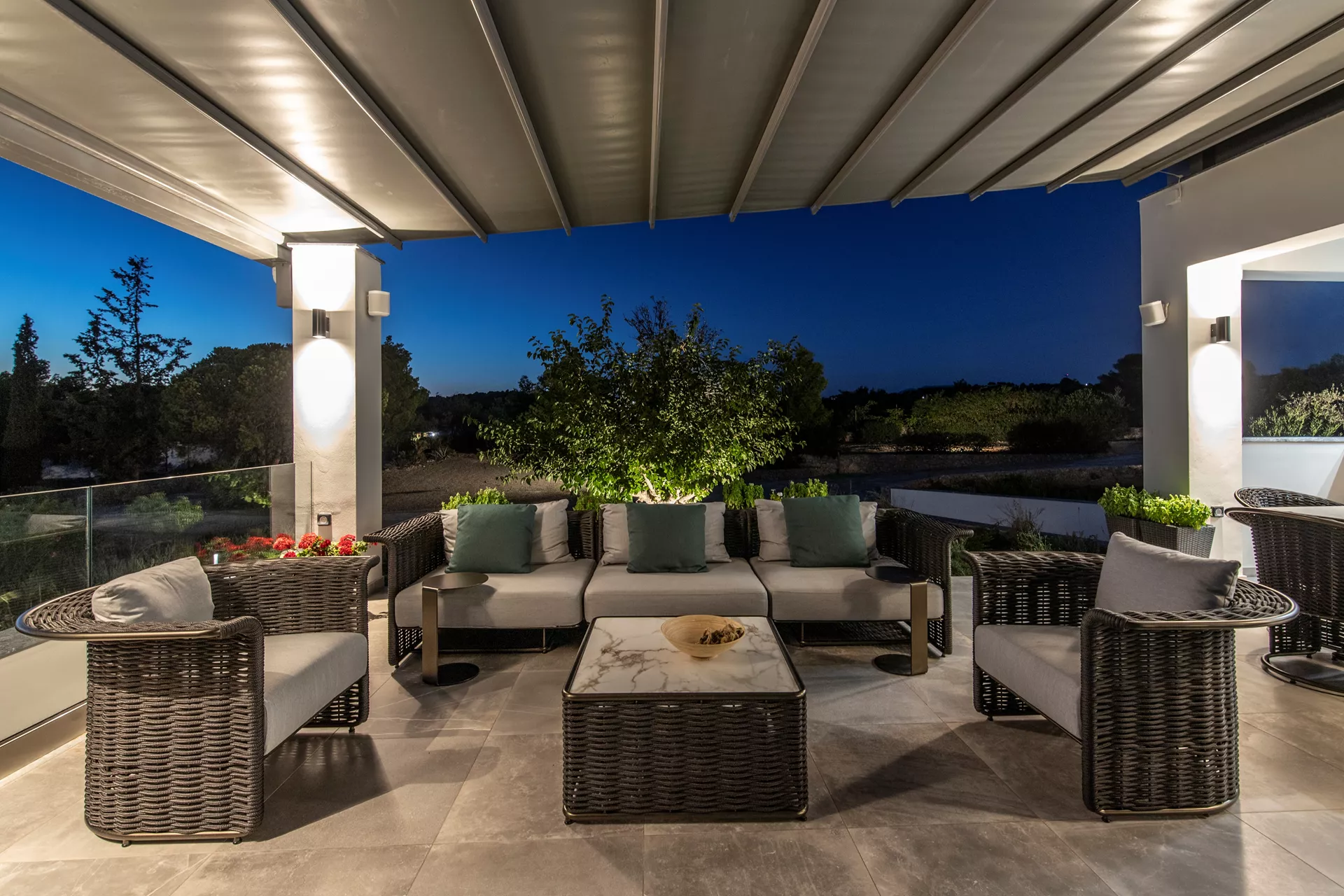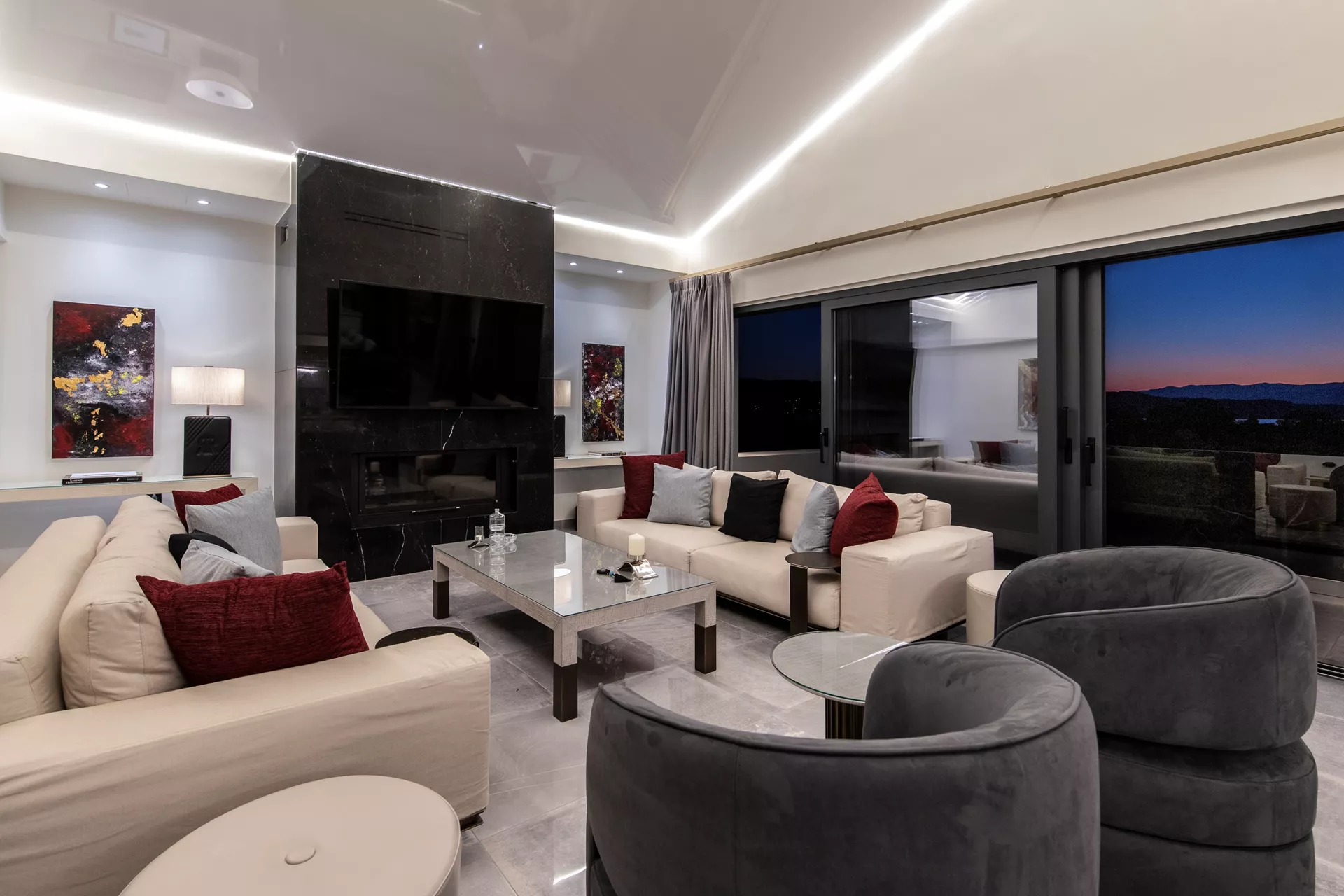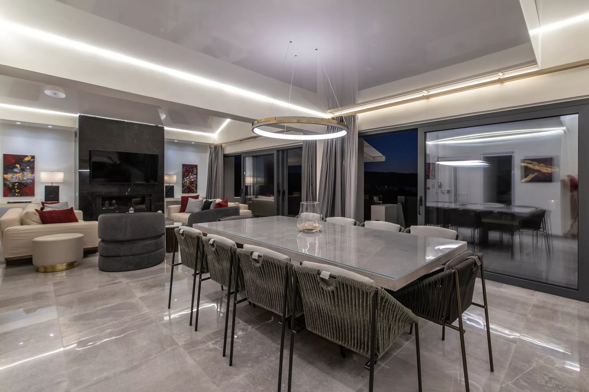 Upon entering the villa, you will find yourself in a breathtaking open space that houses the living room with an energy fireplace, an eight-people dining room, the main kitchen, and a bathroom. An office with an ergonomic sofa that converts into a double bed is also located on this level, offering a versatile space that can accommodate additional guests.