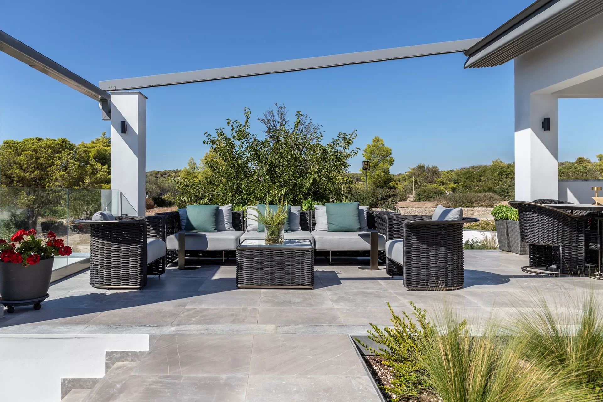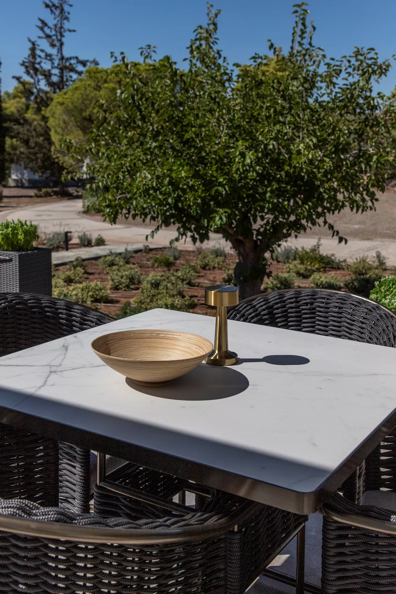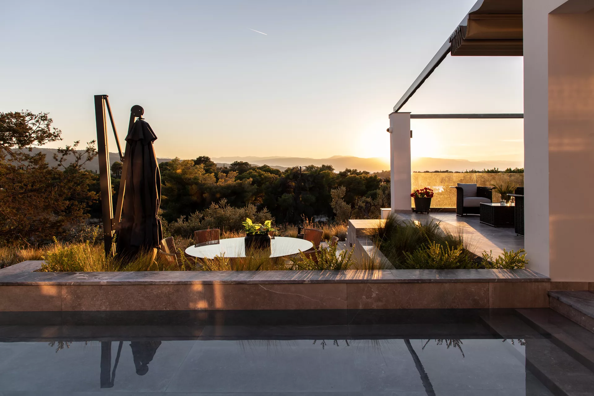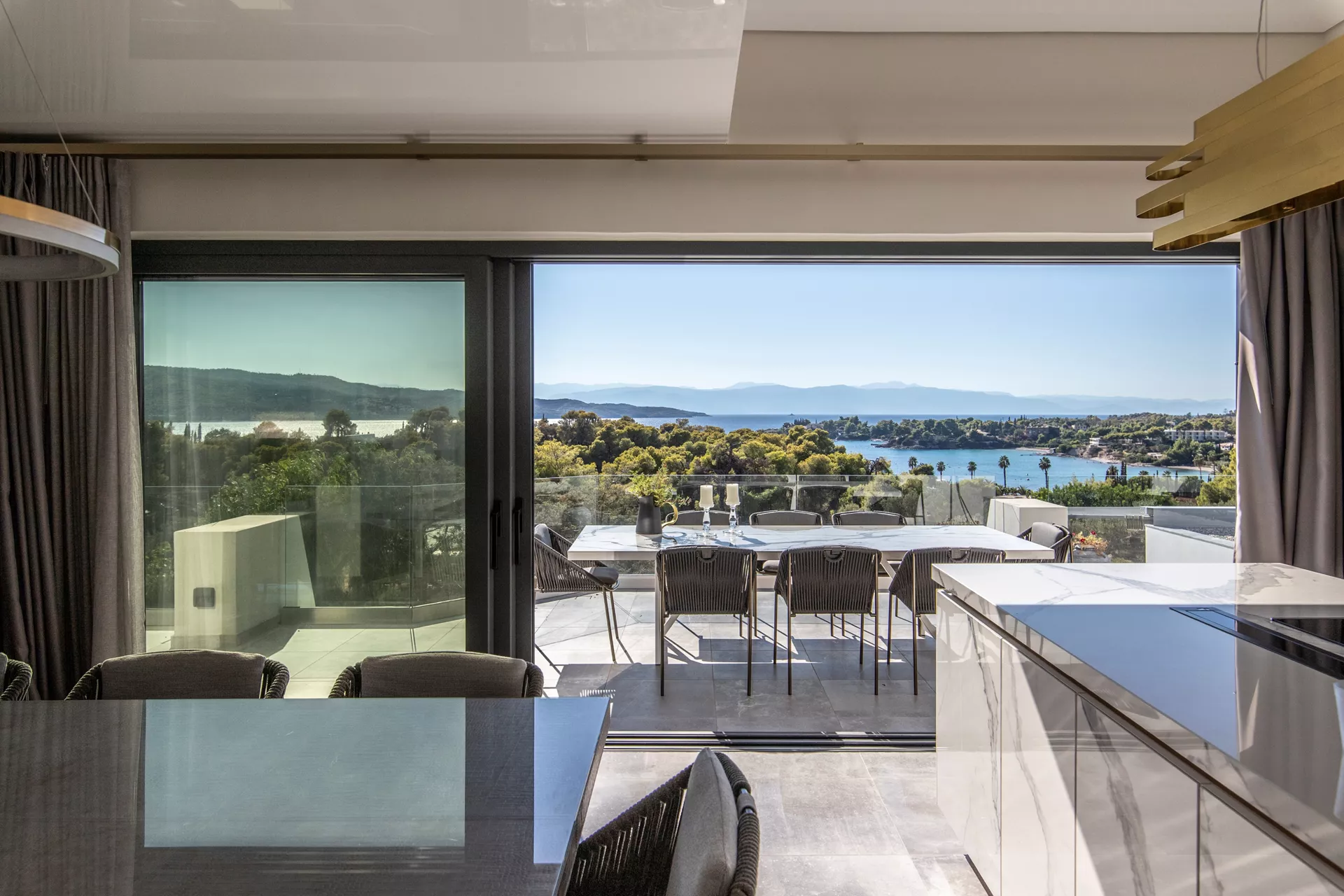 Upon entering the villa, you will find yourself in a breathtaking open space that houses the living room with an energy fireplace, an eight-people dining room, the main kitchen, and a bathroom. An office with an ergonomic sofa that converts into a double bed is also located on this level, offering a versatile space that can accommodate additional guests.