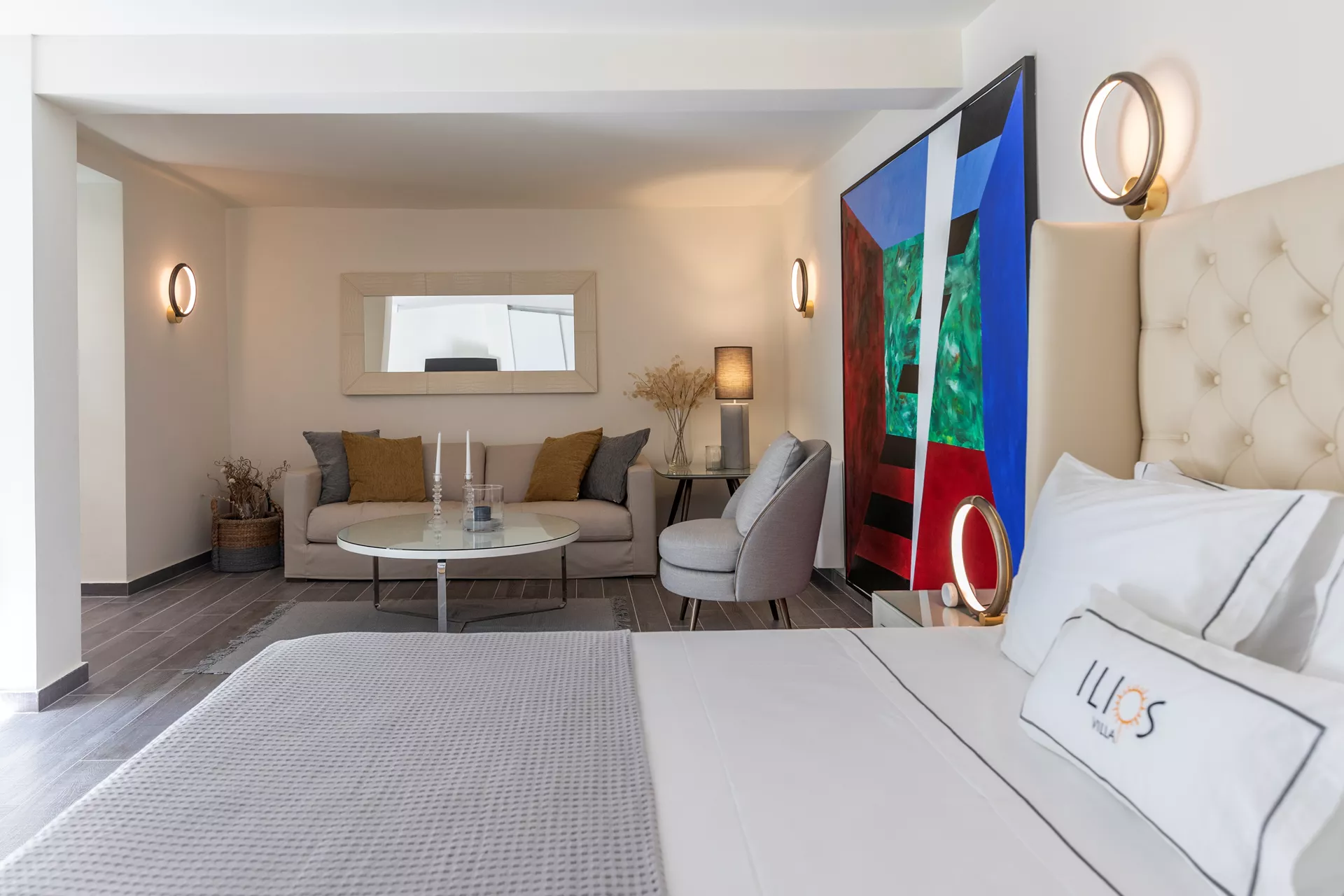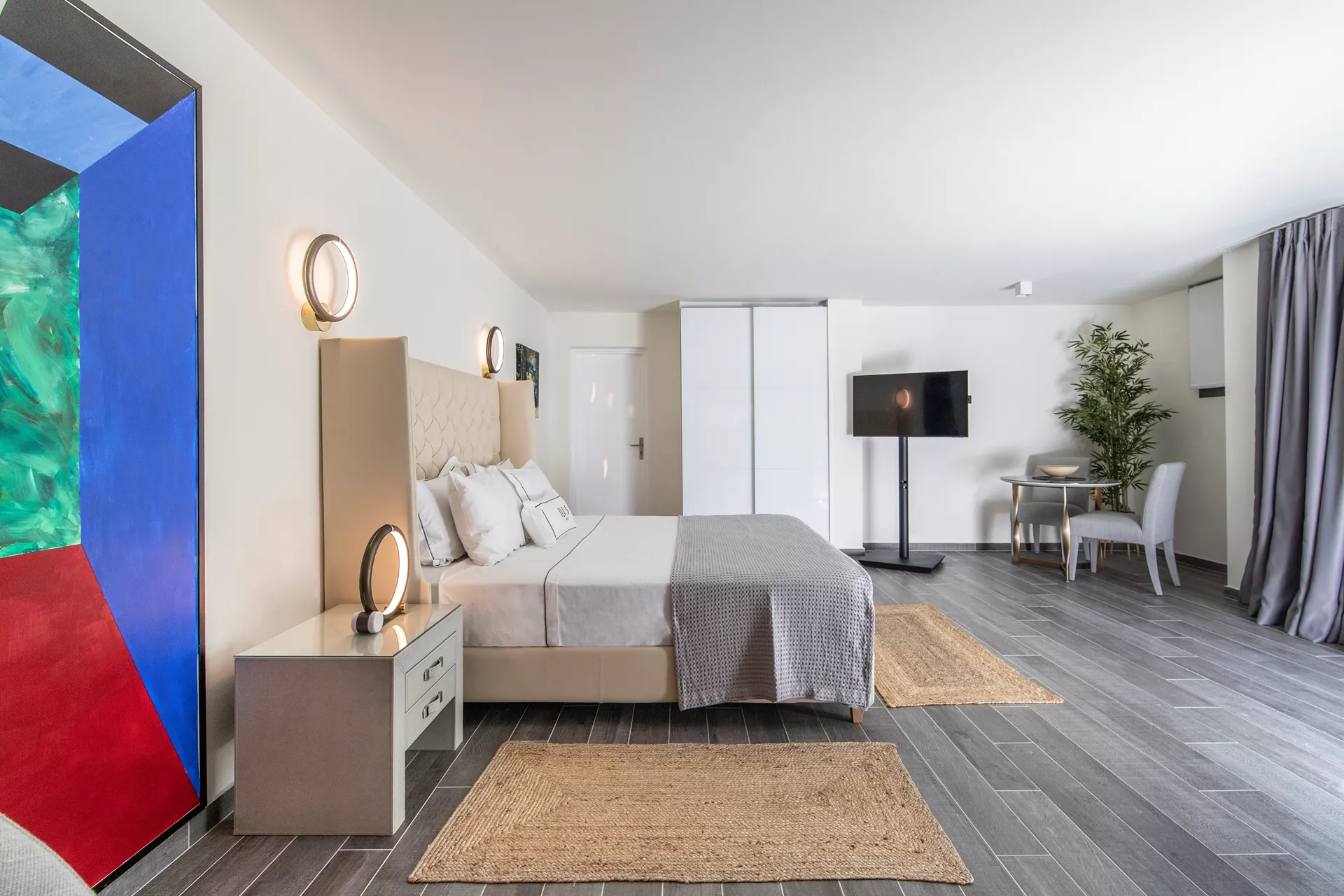 The third level hosts two independent and autonomous guest houses. One is a Junior Hotel Suite with a double bed, bathroom, living room-dining room, and small kitchen, with direct access to the garden. The other is an Executive two-spaced Suite featuring a bedroom, bathroom, kitchen, and living room-dining room, connected with a seventh single bedroom with a bathroom, perfect for staff members or a babysitter.